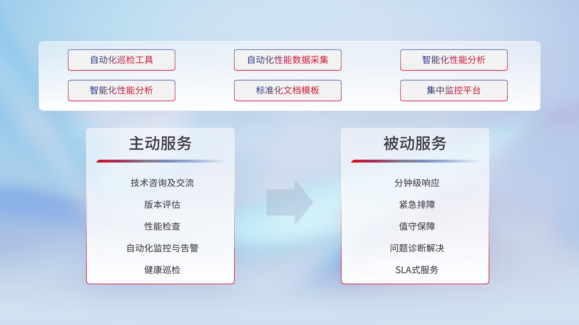 智能化工具和标准化文档,,保障服务质量,,,,提供主动服务(包含技术咨询、、、、版本评估、、性能检查、、、、自动化监控与告警、、健康巡检)和被动服务包含(分钟级响应、、、紧急排障、、、、值守保障、、、、问题诊断解决、、、SLA服务)。。。。