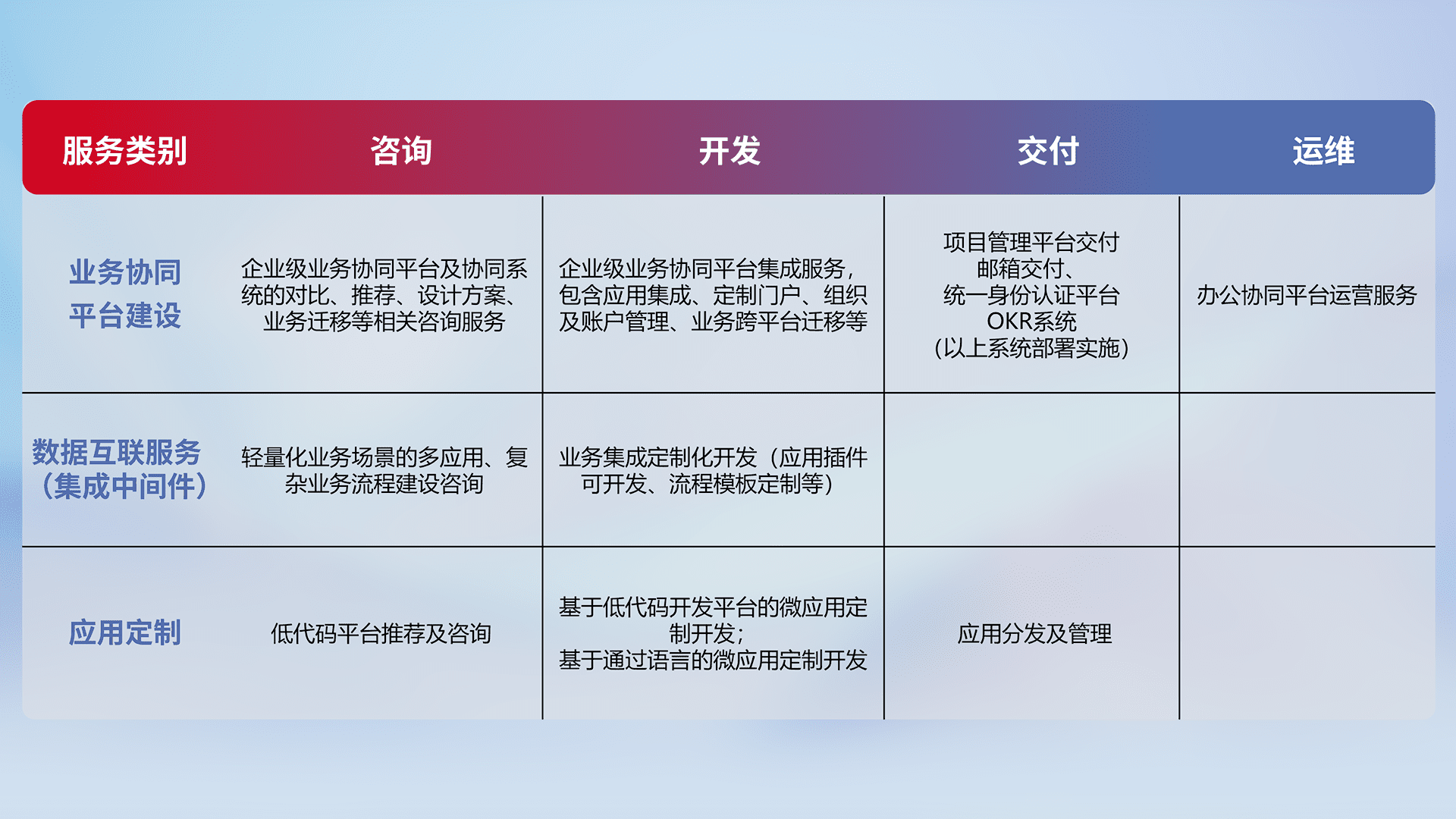 针对钉钉、、企微、、、、IDaas等平台级产品提供产品的规划、、、、方案、、、、交付、、、、定制化开发等服务,,,实现如统一协同办公、、智能客户服务、、、、混合会议管理、、智能数据查询、、、、等业务场景,,,实现数字化转型。。。